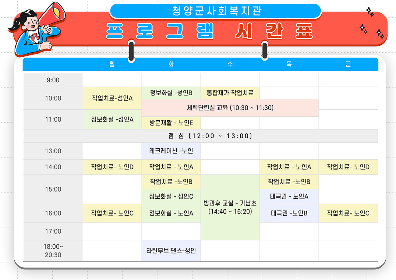 청양군사회복지관에서는 지역주민에게 다양하고 전문적인 프로그램을 제공하여 자기개발과 건강한 심신의 기능 유지 · 관리 · 문화 · 예술 · 사회생활의